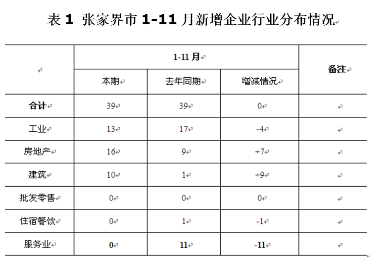(二)新增“四上”企业的行业分布。分行业看,1-11月新增规模以上工业企业13家;资质内建筑业企业10家;房地产开发经营企业16家。跟去年同期数相比,除资质内建筑业和房地产业大幅增加外,其他各行业均大幅减少,批零住餐和重点服务业更是出现零增长(见表1)