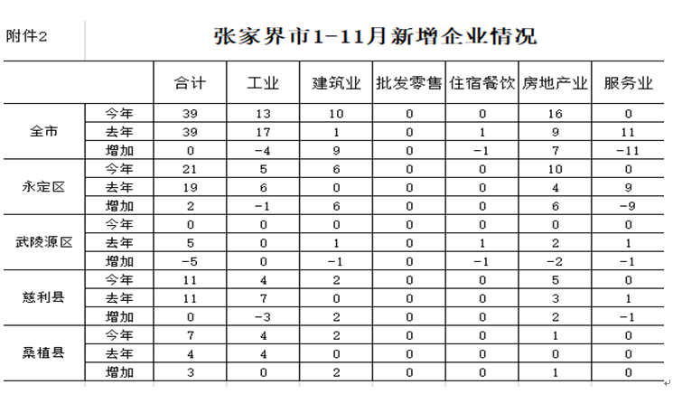 (三)新增“四上”企业的区域分布。分区县看,1-11月新增单位从多到少依次为:永定区21家,同比增加2家;慈利县11家,同比持平;桑植县7家,同比增加3家,武陵源无新增单位,同比减少5家。(见表2)