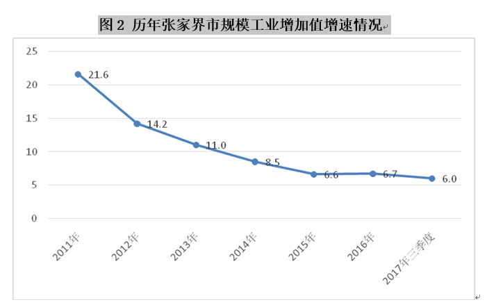 建市以来,全市坚持围绕旅游发展工业,大力推进新型工业化,取得了明显成效。但由于基础差、底子薄等原因,目前整体发展水平仍然不高,今年前三季度全市工业增加值只占GDP的15.4%,造成整体经济结构畸形。从规模工业发展情况来看,前三季度全市规模工业增加值增速为6.0%,自2011年以来逐年走低,工业经济发展形势不容乐观。